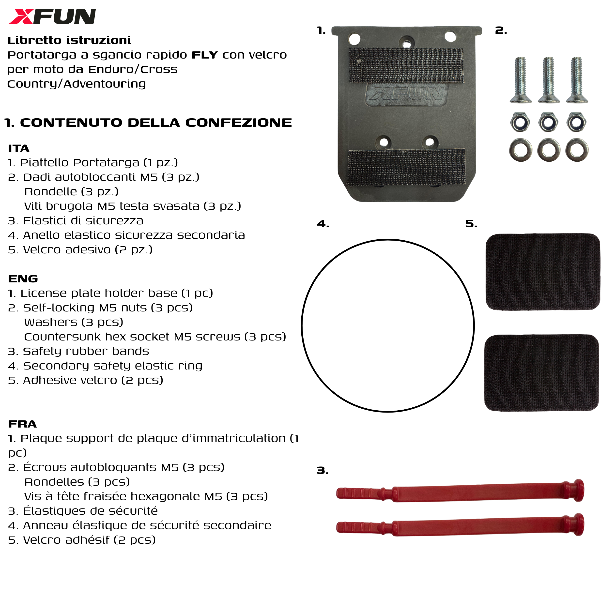 Il portatarga a sgancio rapido con velcro XFUN per Motocross, Enduro e Adventure nasce dall’unione tra tecnologia e praticità, con una struttura in composito ultraleggero e un sistema di aggancio con velcro progettato per un montaggio semplice, veloce e sicuro.